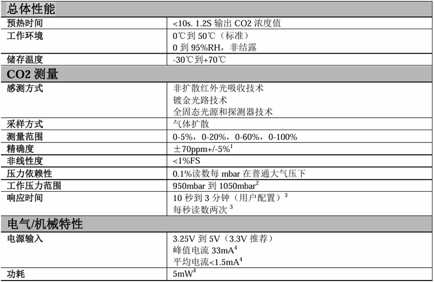 MINIR ExplorIR-M傳感器的技術(shù)參數(shù)如下: